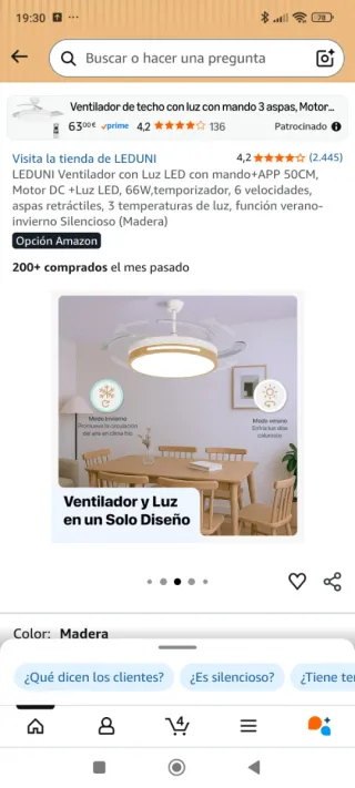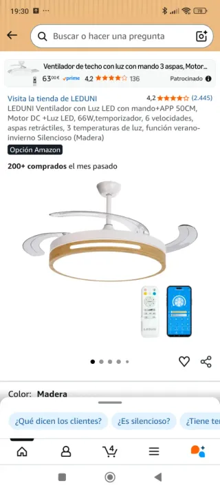 Lámpara de techo con ventilador, luz LED y mando. Está nueva, sin abrir la caja. Compré 3 unidades, pero hay una habitacion que tiene techo abovedado y no lo tuve en cuenta al comparla. El precio no es negociable - Diseño moderno con acabado en madera y blanco. - Incluye mando a distancia para control de funciones. LEDUNI Ventilador con Luz LED con mando+APP 50CM, Motor DC +Luz LED, 66W,temporizador, 6 velocidades, aspas retráctiles, 3 temperaturas de luz, función verano-invierno Silencioso (Madera)