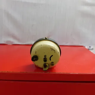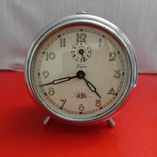 Este es un reloj despertador antiguo con un diseño clásico y elegante. Su mecanismo de cuerda le da un toque vintage. - Esfera redonda con números arábigos. - Manecillas finas y detalladas. - Cuerpo metálico con acabado plateado. - Dos pequeñas patas de apoyo.