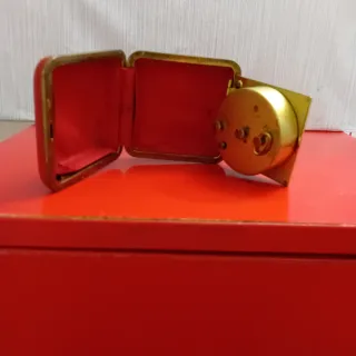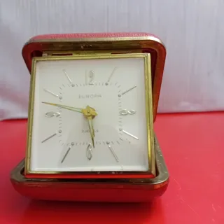 Elegante reloj despertador de viaje de la marca Europa. - Diseño cuadrado con caja plegable. - Esfera blanca con números y manecillas doradas. - Indicador de 2 JEWELS en la esfera.Funciona vien .El estuche esta un poco dereriorado.