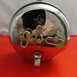 Reloj despertador de estilo clásico con doble campana y acabado metálico brillante. Su diseño retro lo hace un objeto decorativo además de funcional. - Esfera con números grandes para fácil lectura. - Agujas de hora, minuto y segundero. - Asa superior para transporte.No funciona necesita reparacion.