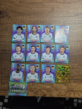 Colección de pegatinas de la selección de fútbol de Alemania para el Mundial de 2022. - Incluye jugadores como Leroy Sané, Serge Gnabry, Jonas Hofmann, Thomas Müller, Joshua Kimmich, Kai Havertz, Leon Goretzka, Antonio Rüdiger, David Raum y Thilo Kehrer. - También incluye la pegatina del equipo completo de Alemania. - Tambien se venden por separado