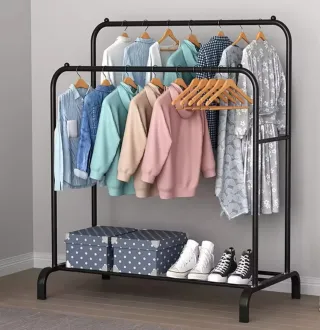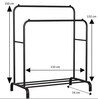 Burro para colgar ropa con dos niveles. - Estructura de metal resistente. - Medidas: 150 cm (alto) x 110 cm (ancho) x 54 cm (profundidad). - Altura barra superior: 150 cm. - Altura barra inferior: 132 cm.