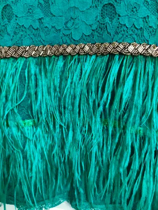 Vestido verde con plumas y pedrería