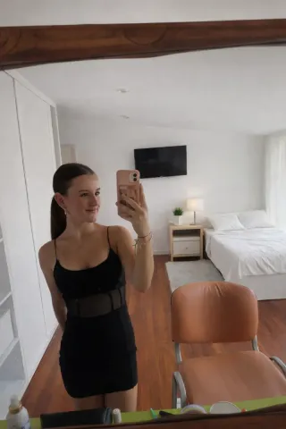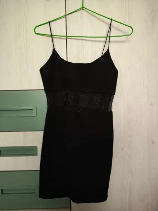 Vestido negro corto con detalles de malla transparente en la cintura. Diseño elegante con tirantes finos. - Tejido elástico. - Corte ajustado. - Abertura en la espalda.