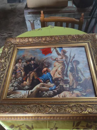 Reproducción del famoso cuadro La Libertad guiando al pueblo de Eugène Delacroix. Una pieza icónica con un marco dorado. - Representación de la Revolución de 1830. - Marco dorado con detalles ornamentales.