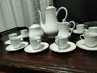 Elegante conjunto de tazas de porcelana con detalles dorados. - Diseño con acabado en espiral. - Borde de las tazas y platillos con filo dorado. - Incluye tetera, azucarero y lechera. Hay un plato que viene sin taza.
