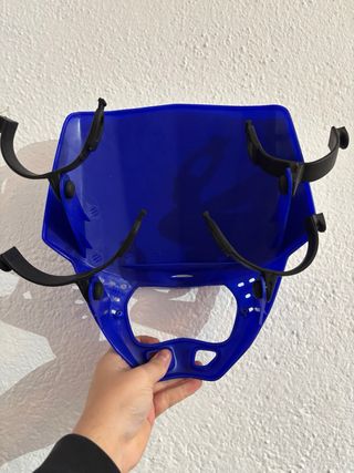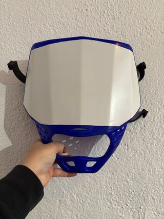 Careta de moto con diseño en blanco y borde azul. Cuenta con correas de sujeción negras. - Color: Blanco y azul. - Correas: Negras. Tiene un pequeño rozon en el lateral izquierdo. Por lo demas se encuentra en perfectas condiciones.