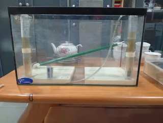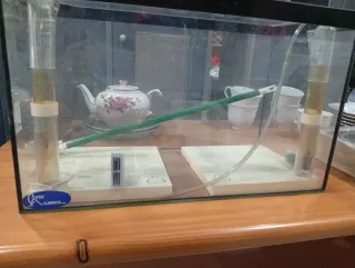 Acuario de cristal con accesorios para su montaje. - Estructura principal de cristal. - Dos tubos verticales con líquido. - Manguera verde y tubo de conexión.