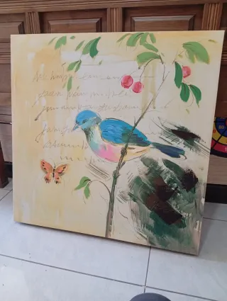 Precioso cuadro lienzo decorativo con un diseño de pájaro y mariposas. 60x60 - Pintura sobre lienzo. - Tonos cálidos y vibrantes.