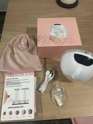 Sacaleches eléctrico wearable, ideal para la extracción de leche materna de forma cómoda y discreta. Incluye todos los accesorios necesarios para su uso. - Sacaleches eléctrico wearable - Bolsa de transporte - Cable de carga USB - Guía de tallas de brida - Medidor de pezón -dos medidas para el pezon de 21m y 19m