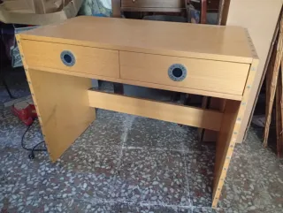 Escritorio con un diseño moderno y funcional. 95x51x78 alto - Acabado en madera clara. - Patas y estructura de soporte en metal. - Dos cajones con tiradores circulares. - Diseño abierto en la parte inferior.
