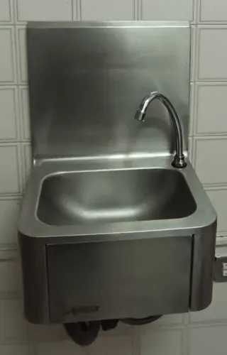 Conjunto de lavamanos con grifería para agua fría y caliente. - Lavamanos de acero inoxidable. - Grifo de diseño moderno. - Panel protector de acero inoxidable. - portarrollos papel secamanos - dosificador jabón - calentador de agua eléctrico 50 litros