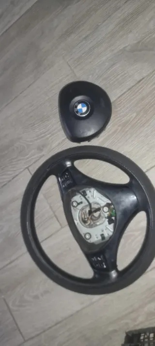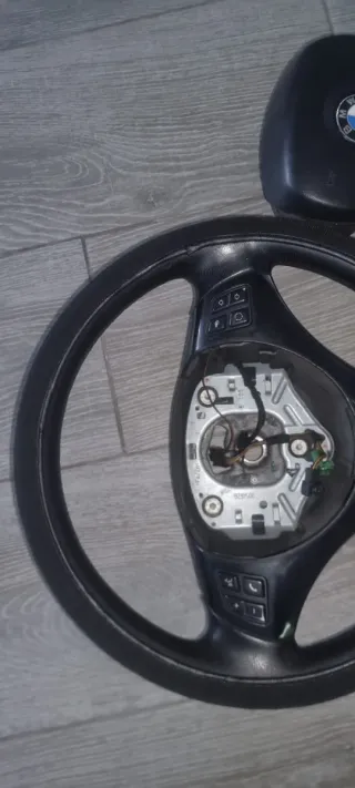 Volante y airbag de BMW serie E90. El volante es de cuero negro y tiene controles multifunción. - Volante de cuero negro - Airbag con logo BMW - Controles multifunción Esta para tapizar por eso se tien la funda 25 solo volante y 25 el airbag