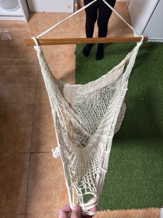 Este sillón colgante es perfecto para tu jardín o terraza. Su diseño tejido le da un toque acogedor. - Estructura de madera. - Tejido en color beige y marrón.
