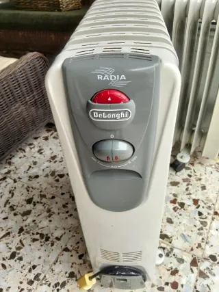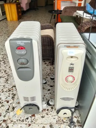 Se venden dos radiadores de aceite, uno de la marca DeLonghi y otro de la marca Zodel. Ambos son de color blanco y gris, fabricados en plástico. - Radiador DeLonghi con selector de temperatura. - Radiador Zodel con selector de temperatura y etiqueta de precio de 20€. Cada uno .