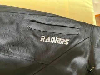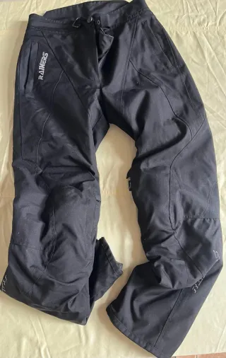 Pantalón de moto color negro tejido poliamida y poliéster. Muy resistente. Presenta la protecciones en las rodillas. Forro para clima frío, extraible. Talla L, equivale a una 38 de mujer. Usado 1 vez, en perfecto estado. Marca rainers. Presenta una decoración en la parte trasera.