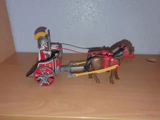 Set de Playmobil de una cuadriga romana. - Incluye figura de soldado romano. - Dos caballos marrones. - Carro de guerra con detalles. - Accesorios de arnés y riendas.