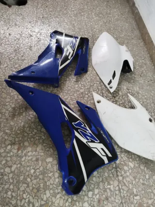 Kit de plásticos para Yamaha YZF 250. - Plásticos azules con diseño YZF. - Plásticos blancos.
