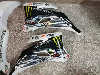 Kit de plásticos para Yamaha YZF/WR 250. - Guardabarros delantero. - Guardabarros trasero. - Placas laterales. - Faro delantero 55e - Adhesivos de marcas como Monster Energy, Dunlop, Taper, Acerbis, Polisport, Oakley, Motul, Boost Mobile y Yamaha.