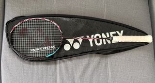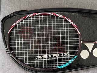Raqueta de bádminton Yonex Astrox 100 Tour. La raqueta está recién encordada con cordaje Yonex BG80 a una tensión de 12 kg. Ha sido utilizada solo dos veces y se encuentra en perfecto estado, sin marcas ni golpes. Además, incluye una funda protectora negra con el logo de Yonex.