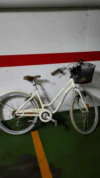 Bicicleta de paseo en color crema, ideal para moverse por la ciudad. Cuenta con un diseño cómodo y práctico. - Cesta delantera. - Guardabarros. - Sillín confortable.