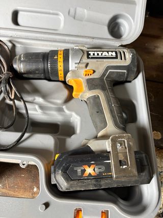 Taladro percutor Titan de 18V con batería de 2Ah y cargador. - Incluye maletín para transporte. - Batería de 18V. - Cargador incluido. Poco uso