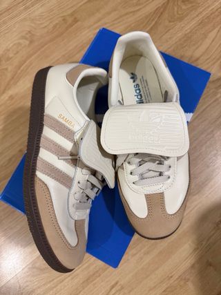Zapatillas Adidas Samba en tonos beige y marrón. Un clásico atemporal con un diseño icónico. - Parte superior de cuero y gamuza. - Suela de goma. - Detalle de las tres rayas. - Cierre de cordones.