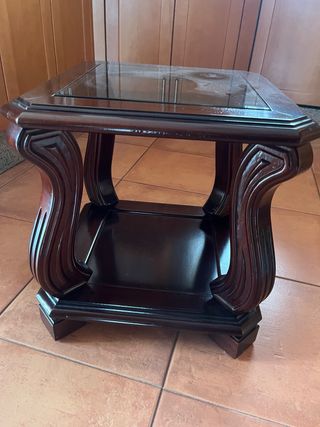 Elegante mesa auxiliar con un diseño clásico. - Encimera de cristal. - Estructura de madera oscura. - Estante inferior adicional.