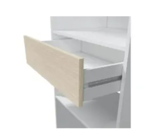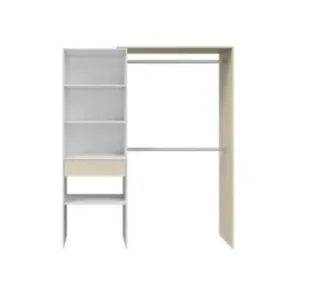 Vestidor modular en buen estado, con un diseño práctico y funcional. - Estructura principal en color blanco. - Panel lateral en tono beige. - Combinación de baldas y cajón. - Barra para colgar ropa.