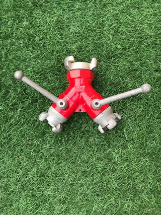 Accesorio para mangueras de bomberos con conexión en Y. - Color rojo. - Conexiones de metal plateado. - Dos salidas laterales con palanca de cierre. - Conexion a boca de bomberos con dos salidas toma Barcelona