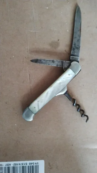 Navaja de sommelier con mango de nácar y detalles metálicos. - Cuchilla principal afilada. - Cuchilla secundaria. - Sacacorchos integrado. Gathen solingen Alemania