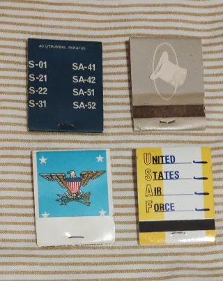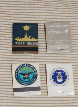 Lote de cerillas de colección con motivos militares y aeronáuticos. - Cerilla con diseño de submarino y texto FLOTILLA DE SUBMARINOS. - Cerilla con diseño de avión y texto 94TH AERO SQUADRON NORTH PHILADELPHIA AIRPORT. - Cerilla con el escudo del DEPARTMENT OF DEFENSE UNITED STATES OF AMERICA. - Cerilla con el escudo del DEPARTMENT OF THE AIR FORCE UNITED STATES OF AMERICA.