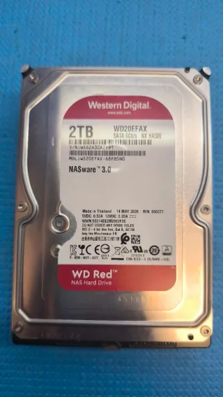 Disco duro Western Digital Red de 2TB, modelo WD20EFAX, diseñado para NAS. Usado pero en buenas condiciones. Formateado a bajo nivel con Victoria Se adjuntan imágenes de salud - Capacidad: 2TB - Interfaz: SATA 6Gb/s - Modelo: WD20EFAX - Diseñado para NAS (Network Attached Storage) - Fabricado en Tailandia