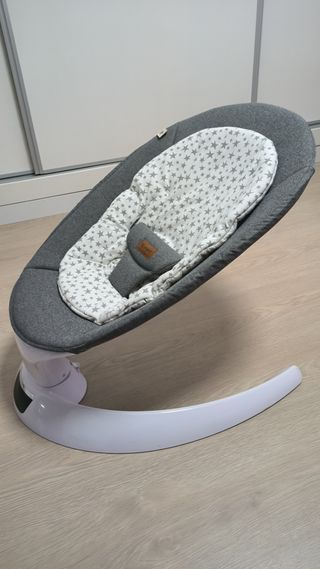 Hamaca electrónica para bebés con un diseño moderno y cómodo. Ofrece un suave balanceo y apoyo completo para el bebé. Con control táctil y mando a distancia. Tiene melodías relajantes y sonidos naturales, temporizador ajustable. Tapizado suave y transpirable. 5 velocidades de balanceo. Funciona conectada a la corriente o con pilas. Está como nueva, apenas se ha usado. - Funda con estampado de estrellas grises. - Base blanca. - Acolchado suave para el confort del bebé.