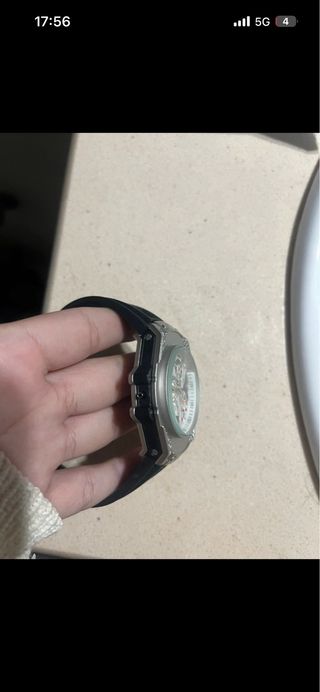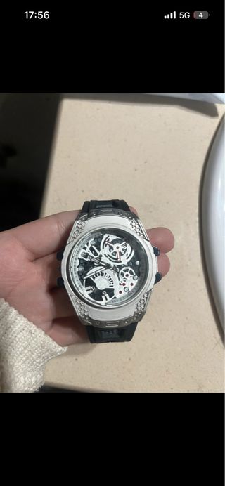 Reloj de pulsera con un diseño moderno y llamativo. La esfera abierta permite ver la maquinaria. - Correa de caucho. - Detalles en la caja.