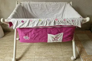 Realizo envios. Minicuna moises con ruedas,para bebé color blanco fabricada en madera. Con su precioso juego de vestiduras sabanas y colchones a juego,con un diseño encantador en tonos rosa y blanco.Tejido exterior rosa con detalles bordados y bolsillo, marca pirulos,coimasa.100x 100 algodon.Interior blanco con estampado de lunares.Adornos de flores y círculos de colores.2 colchones ,funda de plastico para colchon,funda de colchon color rosa.almohada,funda de almohada con flor.edredon superior hello baby con gatito y flores a juego. Todas las vestiduras recien labadas.todo esta en muy buen estado ver imagenes.