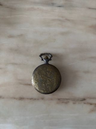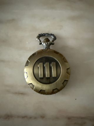 Reloj de bolsillo coleccionable con diseño inspirado en Fallout 76. Presenta un acabado metálico en tono bronce y un detalle de engranaje en el borde. - Diseño frontal con el número 111 en relieve. - Cadena decorativa en la parte superior. El reloj no es funciona es un elemento decorativo para coleccion