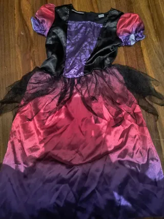 Disfraz de bruja con un diseño vibrante y detalles llamativos. - Mangas abullonadas con degradado rosa y morado. - Cuerpo negro con estampado de telaraña morada. - Falda con tul negro y degradado de rosa a morado. Es un vestido