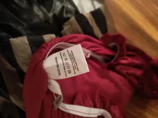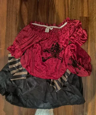 Disfraz temático de pirata, ideal para fiestas o eventos. - Incluye top , falda, y gorro - Diseño con calaveras y espadas cruzadas. - Colores: rojo y negro con detalles dorados.