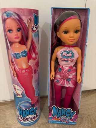 Dos muñecas Nancy, una modelo Coral con cola de sirena y otra modelo Pink Candy. - Muñeca Nancy Coral con cola de sirena. - Muñeca Nancy Pink Candy con conjunto rosa. - Altura de la muñeca Coral: 45cm.