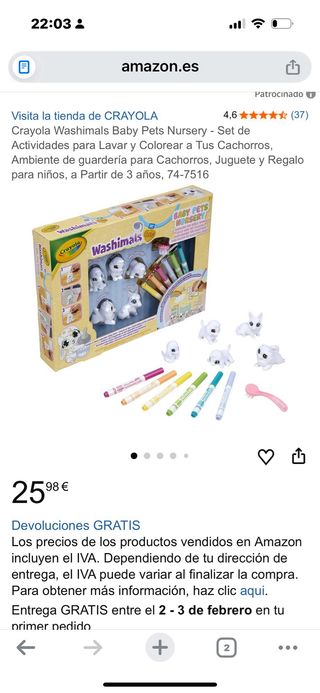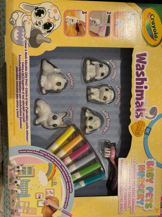 Set de juego Crayola Washimals Baby Pets Nursery. Incluye figuras de mascotas adorables para colorear y lavar. - 5 figuras de mascotas Washimals. - 5 rotuladores lavables. - Cepillo para lavar. - Fondo reutilizable para decorar.