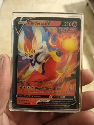 La carta Pokémon que se muestra es una Cinderace V de la expansión Golpe Fusión (Fusion Strike). Específicamente, es la carta con el número de coleccionista 043/264. Es una carta de efecto según la posición se una postura o otra ,la otra carta es normal