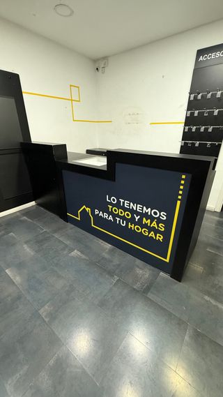 Mostrador de recepción o atención al cliente, diseñado en módulos. - Diseño moderno con líneas limpias. - Combinación de colores llamativa. - Ideal para puntos de información o venta. -Lo que tiene es una pegatina se puede quitar