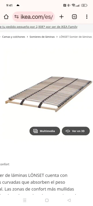 Somier de láminas LONDSET de IKEA, tamaño 90x200 cm. Diseñado para ofrecer confort y soporte. - Láminas curvas que absorben el peso corporal. - Zonas de confort más mullidas alrededor de caderas y hombros. - Mantiene la espalda alineada para un mayor confort y apoyo. Está nuevo lo monté y no me encajaban las medidas,. Sirve para muebles Ikea o para dormir en el suelo, no lleva patas. Por las medidas solo venta en persona.