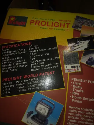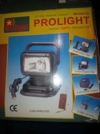 Proyector de luz portátil Prolight de 12 voltios con control remoto inalámbrico y base magnética. - Rotación de 440° y elevación de 120°. Base magnetica o fija.