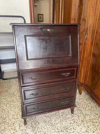 Elegante escritorio antiguo de madera con un acabado en tonos rojizos y marrones. Perfecto para dar un toque clásico a tu hogar. - Diseño de secreter con tapa abatible. - Dos cajones inferiores con tiradores. - Estantes interiores para organización.