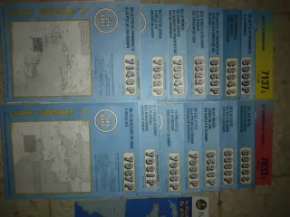 Conjunto de cartas náuticas del Servicio Hidrográfico y Oceanográfico de la Marina (SHOM) que cubren el noroeste de Francia. Incluyen detalles de la costa y el mar. Unidad 3€, todas x 25€ - De la Pointe de Penmarc'h a la Pointe de Trévignon (7146P) - De la Chaussée de Sein a Belle-Ile (7067P) - Abords de Lorient (7031P) - De l'Île de Groix a Belle-Ile (7032P) - De la Pointe de Saint-Gildas au Goulet de Fromentine (7394P) - Des Sables-d'Olonne a la Pointe du Grouin du Cou (6522P) - Du Goulet de Fromentine a St-Gilles-Croix-de-Vie (6533P) - De la Rochelle a Rochefort (6334S) - Golfe du Morbihan (7137L) - De Quiberon au Croisic (7033L
