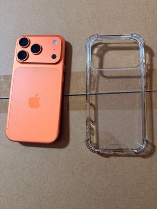 Este iPhone 17 Pro en color naranja. Se vende con CAJA, FACTURA Y CABLE DEL MOVIL Dos fundas transparentes y protectores de pantalla Es E SIM NO ACEPTO CAMBIOS