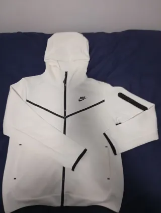 Sudadera con capucha Nike Tech Fleece en color blanco. Diseño moderno con detalles en negro. -Precio negociable, hago ofertas. - Cremallera completa. - Bolsillos laterales. - Capucha ajustable. - Logo de Nike en el pecho.
