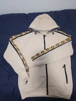 Chándal de la marca Gucci en color beige con detalles en dorado. -Precio negociable, hago ofertas. - Diseño con estampado de la marca Gucci en las mangas y capucha. - Cremallera frontal completa. - Bolsillos laterales con cremallera. - Número 1 estampado en la parte frontal.